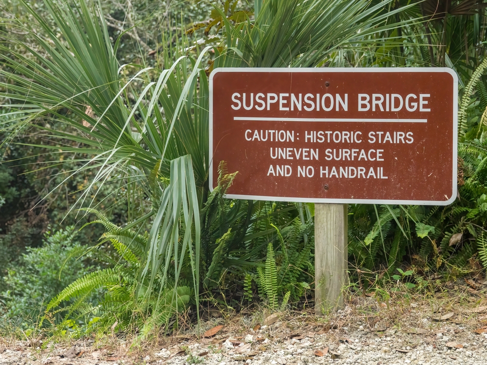 Original limestone structures from 1933 still serve park visitors today. Primary entrance columns feature Art Deco designs popular in Florida’s Depression-era architecture. Stone retaining walls hold steep garden slopes in place, showcasing CCC stonework skills. A restored amphitheater hosts events in its original location, though wooden benches replaced stone seating for comfort. Suspension bridges have remained a star attraction since the Depression construction days. Engineers designed bridges to span ravines without support columns, preventing erosion damage below. Steel cables anchor into concrete foundations hidden in ravine walls. Bridge decks hang from vertical cables, allowing slight movement in the wind while maintaining stability. The original blueprints show that the bridge calculations accounted for Florida’s hurricane-force winds.